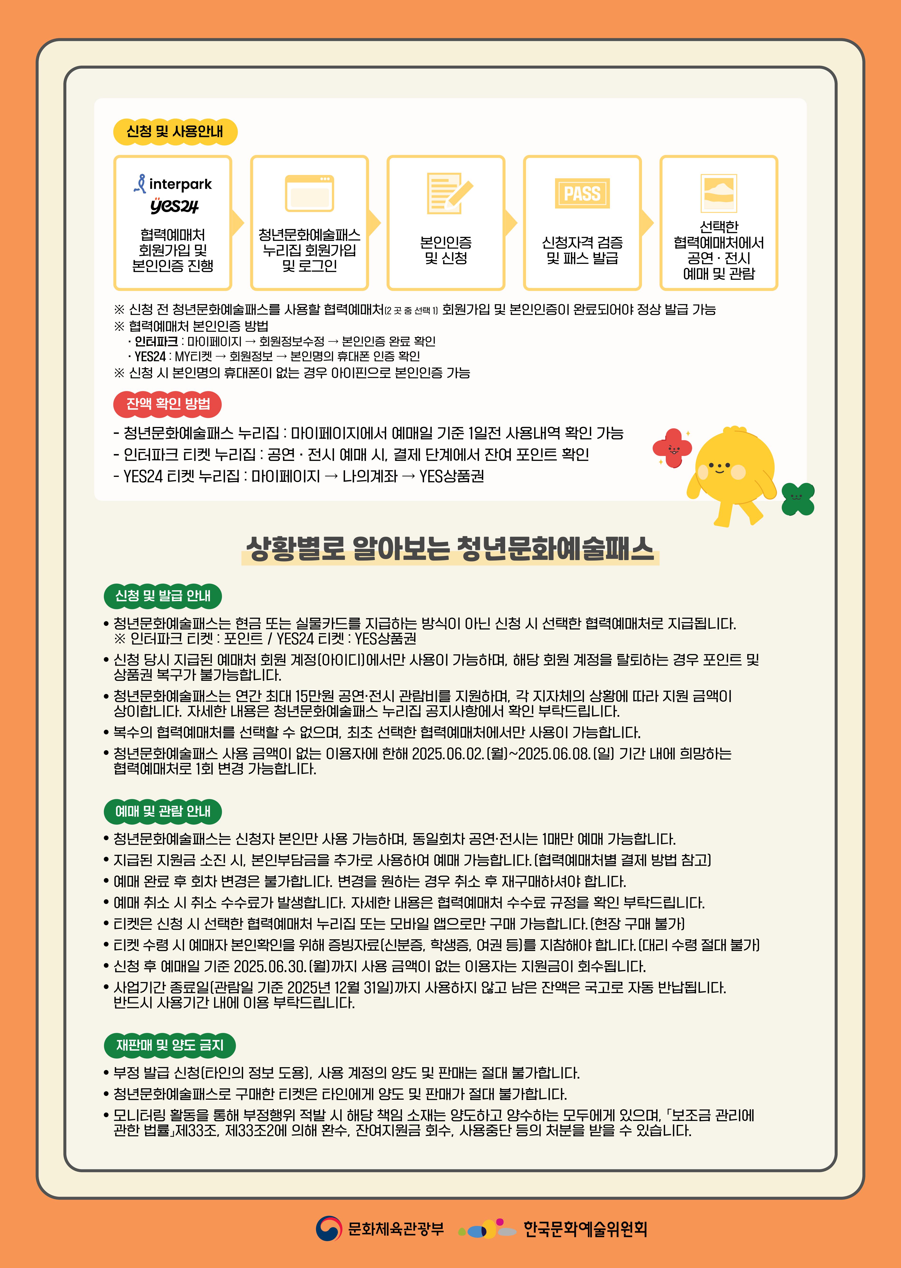 | 내용 | ○ 지원대상 : 민법상 성년이 되는 청년 19세(2006년 출생자)중 선착순 지원 ○ 사용기간 : 발급일로부터 ~ 2025. 12. 31.(수) ○ 지원내용 : 순수예술(공연, 전시)에 사용가능한 청년문화예술패스 (연간 최대 15만원)지원 (국비 10만원 + 지방비 5만원 매칭 지원) ○ 사용방법 : 지정된 티켓 판매 협력예매처(인터파크, yes24 택1)에서 ‘문화예술패스’ 신청·발급 후 공연 및 전시 티켓 구입 시 사용