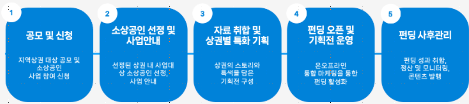 진행 일정 *하단 이미지 참고, 변동 가능 - 공모 및 신청(~10월 24일): 공모 및 신청을 통하여 사업 대상을 최종 확정하며, 자료 취합 및 펀딩 프로젝트를 기획합니다. - 펀딩 및 기획전 오픈(11월 중): 펀딩 오픈 및 기획전을 운영하여 '로컬'과 '브랜드'가 홍보될 수 있도록 합니다. - 사후 관리(12월 중): 기획전 전후로 정성 및 정량적 자료를 요청드릴 예정이며, 정산 및 모니터링을 통한 사후 관리를 진행합니다. ![]() 기타 안내 1) 기획전 성과를 측정하기 위하여, 기획전 참여 전후의 매출 증감 데이터를 요청드릴 수 있습니다. 2) 펀딩 콘텐츠 제작에 필요한 글/이미지 자료와 준비사항(네이버페이센터 가입 등)은 사업 선정 시 담당자가 별도 요청 드릴 예정입니다.