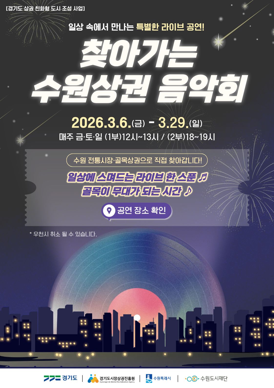 📍 장소 수원시 골목상권 및 골목형상점가 등 24개소 *자세한 장소는 공연 일정을 확인해주세요.