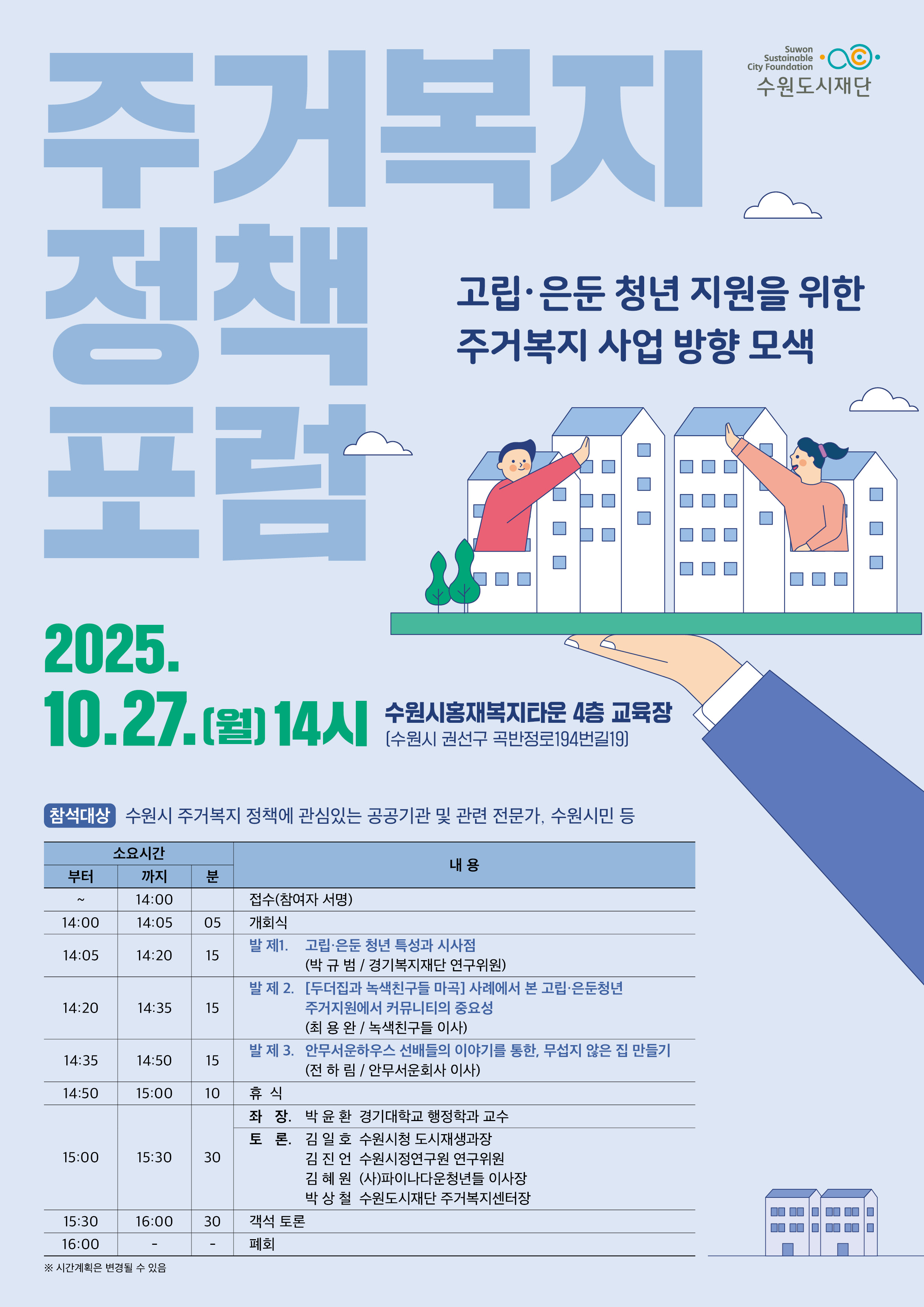 [2025년 수원시 주거복지 포럼 안내] 주제 : 고립·은둔 청년 지원을 위한 주거복지 사업 방향 모색 일시 : 2025.10.27(월) 14:00~16:00 장소 : 수원시홍재복지타운 4층 교육장(수원시 권선구 곡반정로 194번길 19) 참석대상 : 수원시 주거복지 정책에 관심있는 공공기관 및 관련 전문가, 수원시민 등
