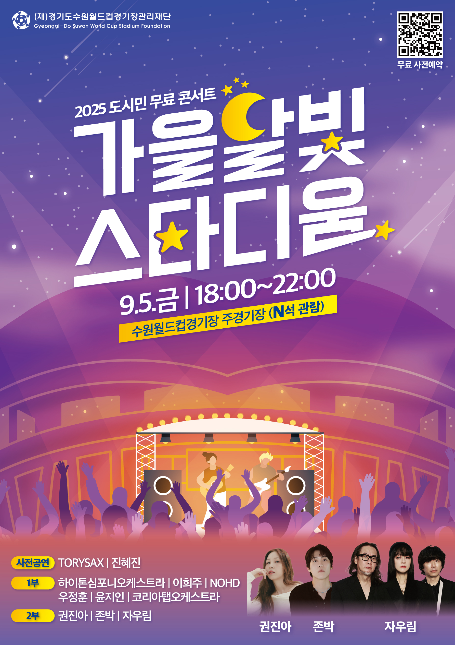 | 내용 | ○ 행 사 명 :『2025 도·시민 무료콘서트 - 가을달빛스타디움』 ○ 일 시 : 2025. 9. 5(금), 18:00 ~ 22:00 (4시간) ○ 장 소 : 수원월드컵경기장 주경기장 ○ 출 연 : 존박, 권진아, 자우림 등 - 사전예약 홈페이지 : 네이버 예약: 도시민 무료콘서트 가을달빛 스타디움(클릭시 링크로 이동)