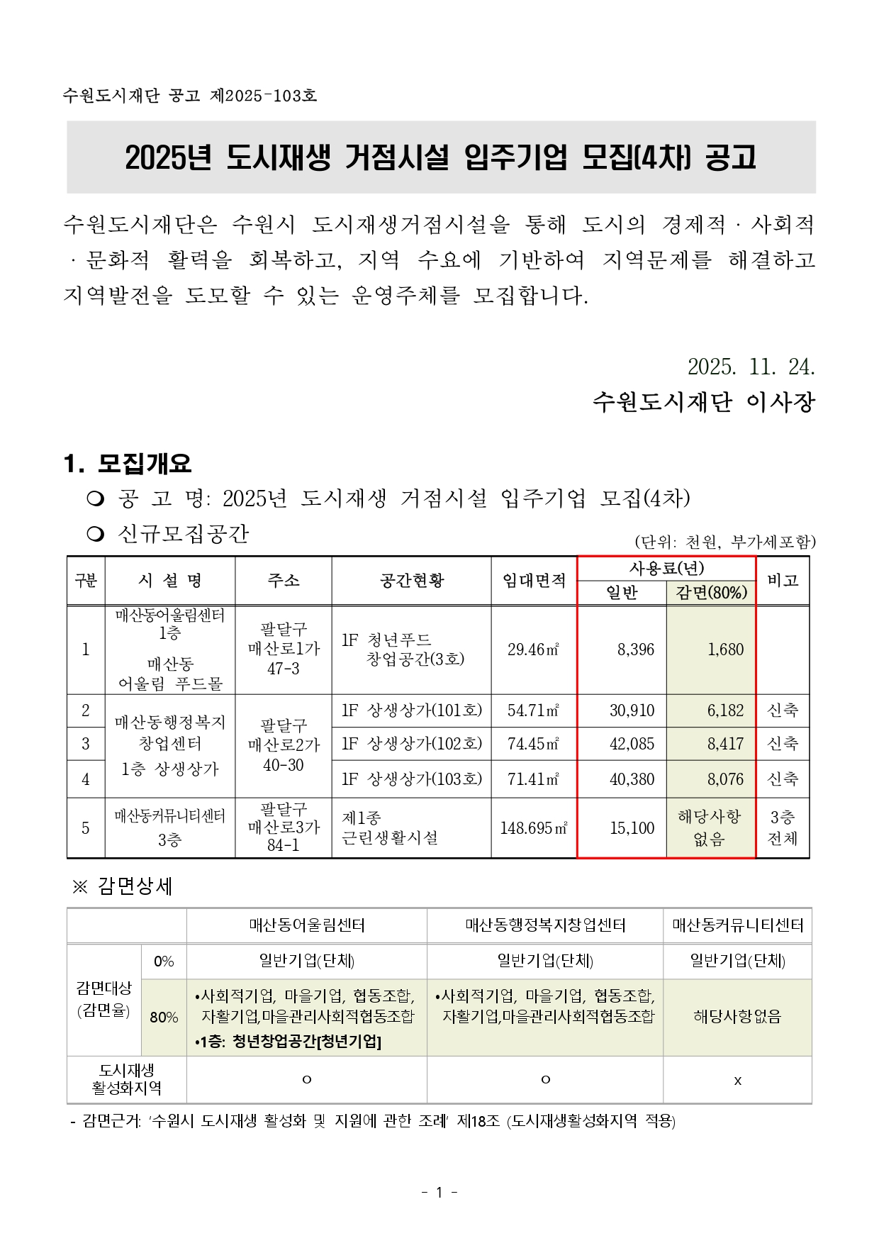 [공고 제2025-103호]2025년 도시재생 거점시설 입주기업 모집(4차)공고