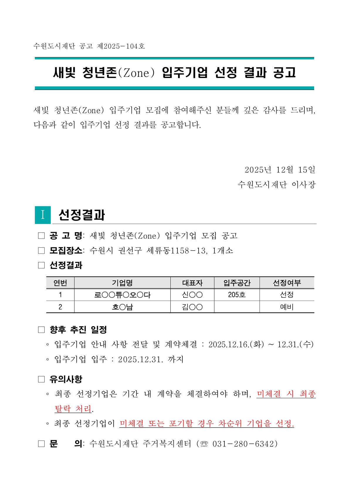 [제2025-104호] 새빛 청년존(Zone)입주기업 선정 결과 공고