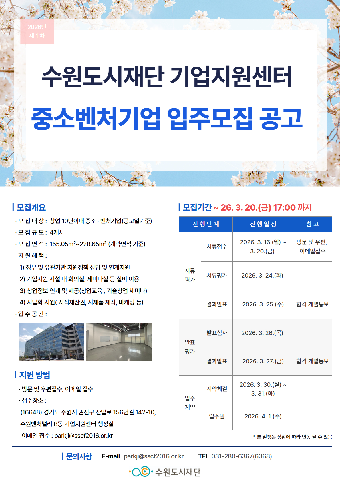 수원도시재단에서는 신산업 분야의 우수한 기술력과 성장 가능성을 갖춘 중소· 벤처기업을 발굴·육성 하기 위해 「2026년 기업지원센터 제1회 중소벤처기업 신규 모집」을 다음과 같이 공고 합니다. 관심 있는 기업인 여러분의 많은 신청 바랍니다.