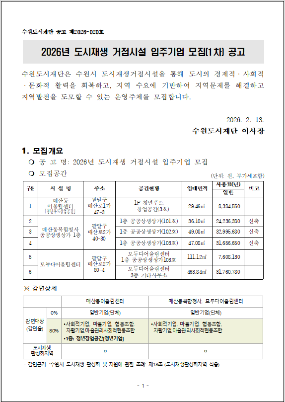 [공고 제2026-019호] 수원시 기업지원센터 1인창조기업 입주모집 공고 ( ~ 3.13)
