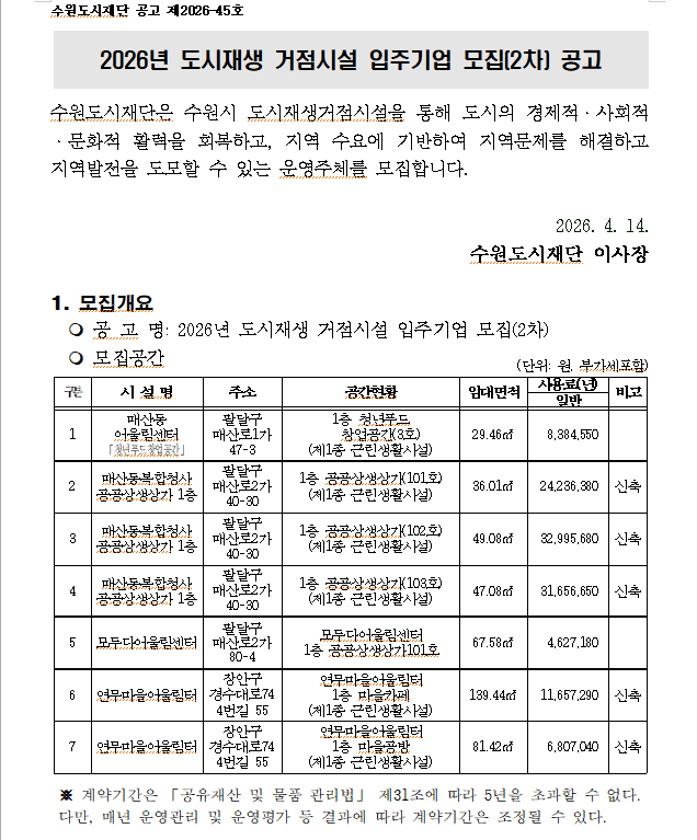 [공고 제2026-045호] 2026년 도시재생 거점시설 입주기업 모집(2차) 공고